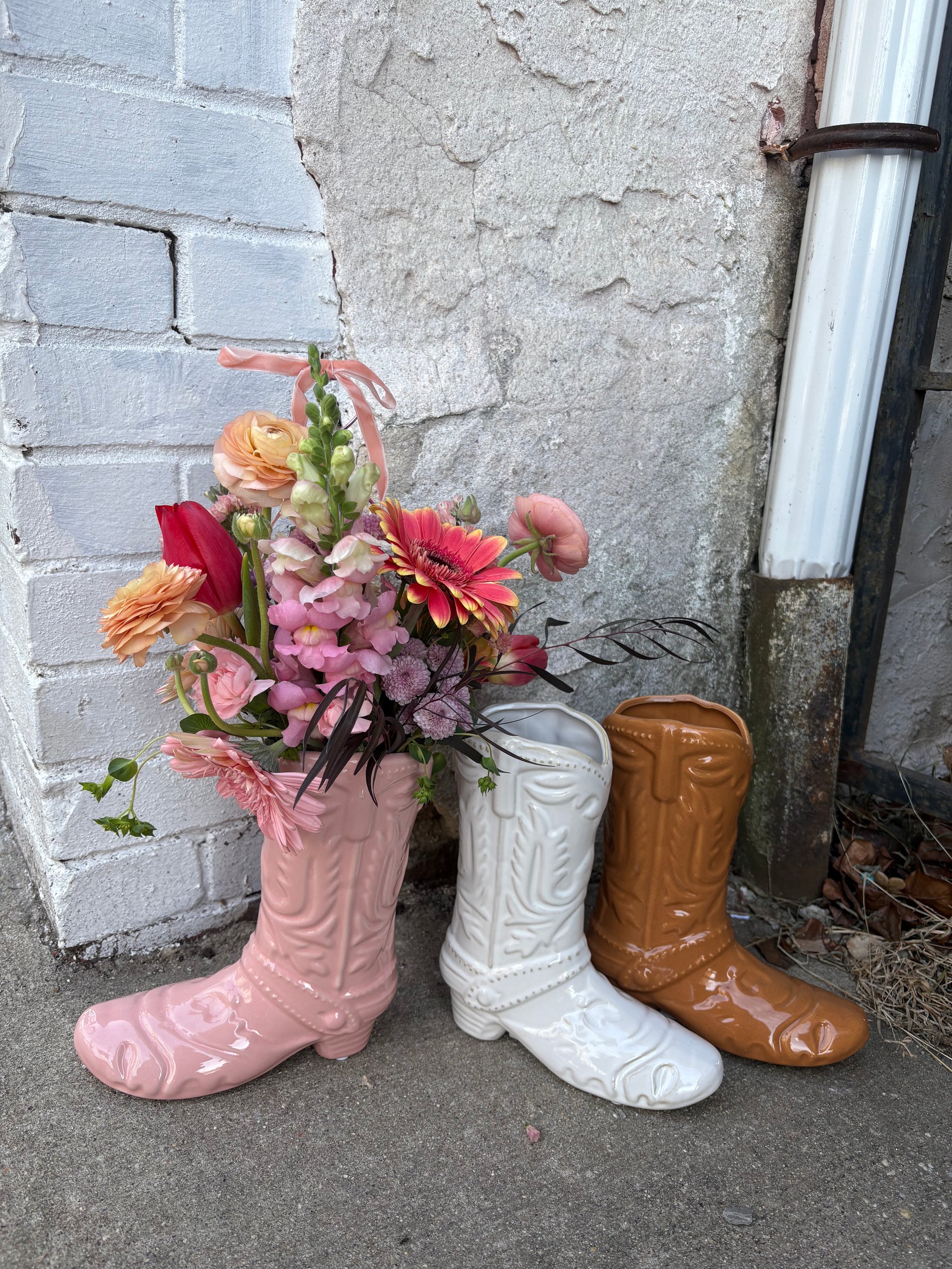 Funky + fun arrangement in a vase. Added extra fun elements that don't take themselves too seriously.
